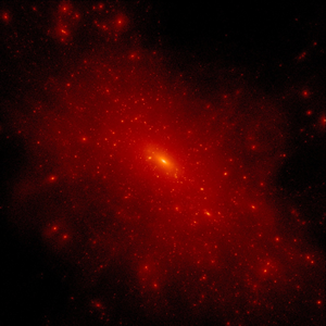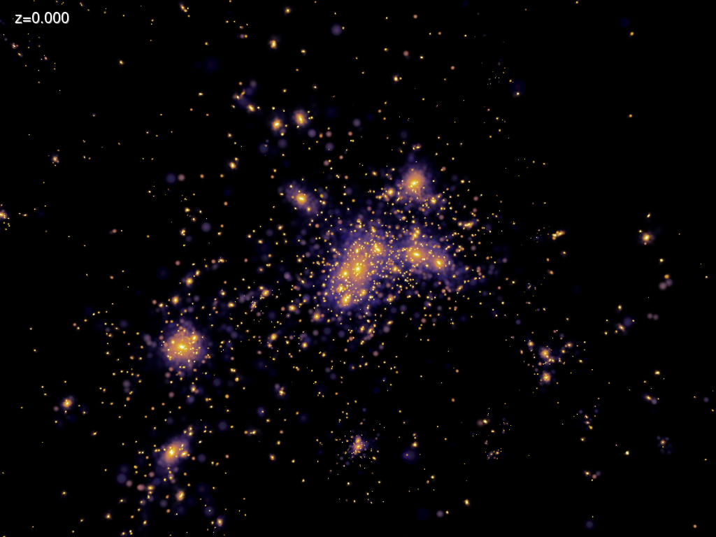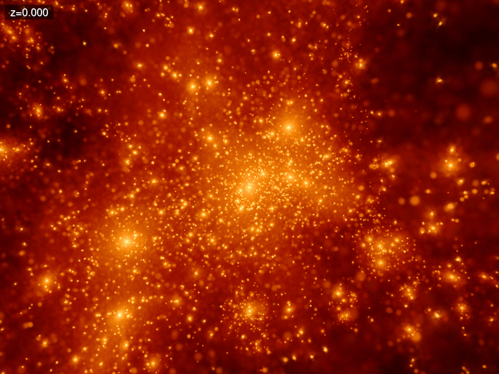Evolution of the stellar density of the resimulated cluster 001, same center and region as for corresponding dark matter and gas movie above. (K. Riebe; PMViewer).