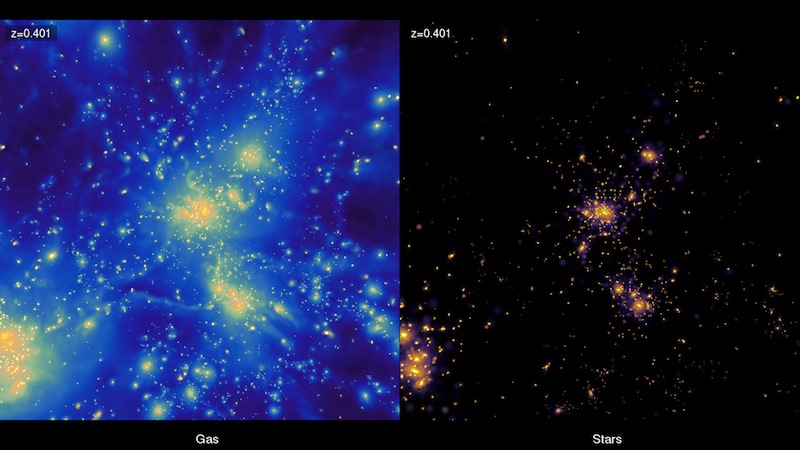Evolution of the gas (left) and stellar (right panel) density of the resimulated cluster 001, same center and region as for corresponding dark matter and gas movie above. (K. Riebe; PMViewer).