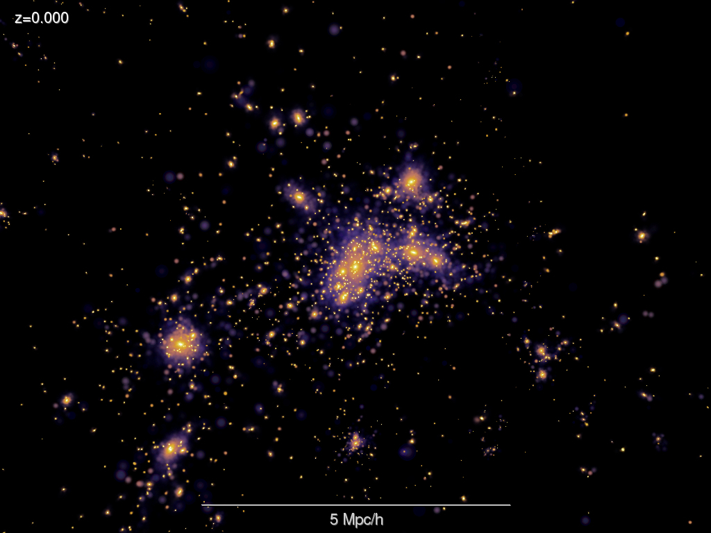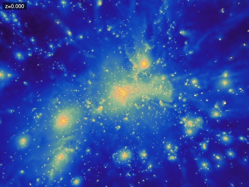Evolution of the gas density in the high resolution resimulation of cluster 001. (Gustavo Yepes, Splotch).