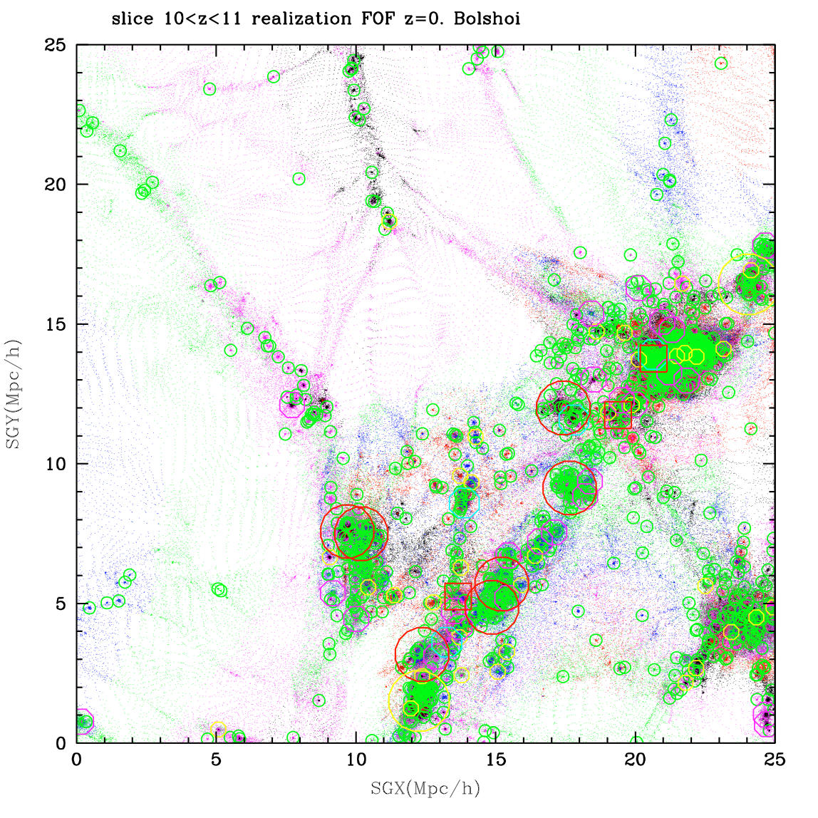 The same region with halos identified with Friends-of-Friends algorithm (Gottloeber, AIP). Compare this and previous plot. FOF finds more of very small halos. Overall, there is good correspondence between the codes for distinct halos.