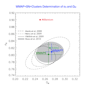 The Bolshoi Simulation (green dot) is in extrememly good agreement with all recent determinations of cosmological parameters, sigma8 and OmegaM, while the millenium simulation (red dot) is far from these parameters.