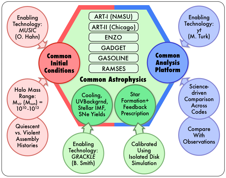 The first major task will be to model a realistic isolated disk galaxy using various codes and their feedback recipes, varying both the feedback parameters and the resolution. The second task will be to compare the codes in cosmological simulations. Specifically, all the participating codes will model the evolution of eight individual galaxies from the Big Bang to the present, resulting in final masses of 1010, 1011, 1012, and 1013 times the mass of the sun (a range from a dwarf galaxy to a galaxy more massive than the Milky Way). For each mass, one set of simulations would model a galaxy having a quiescent merger history (having few mergers with another galaxy its own size) and another would model a galaxy having a violent merger history (having many such major mergers especially later in its life). The final task will be to compare the results, including such observable characteristics as the shape, internal structure and velocities, and spectral energy distribution (distribution of light at different wavelengths) between simulations and with observations of real galaxies.