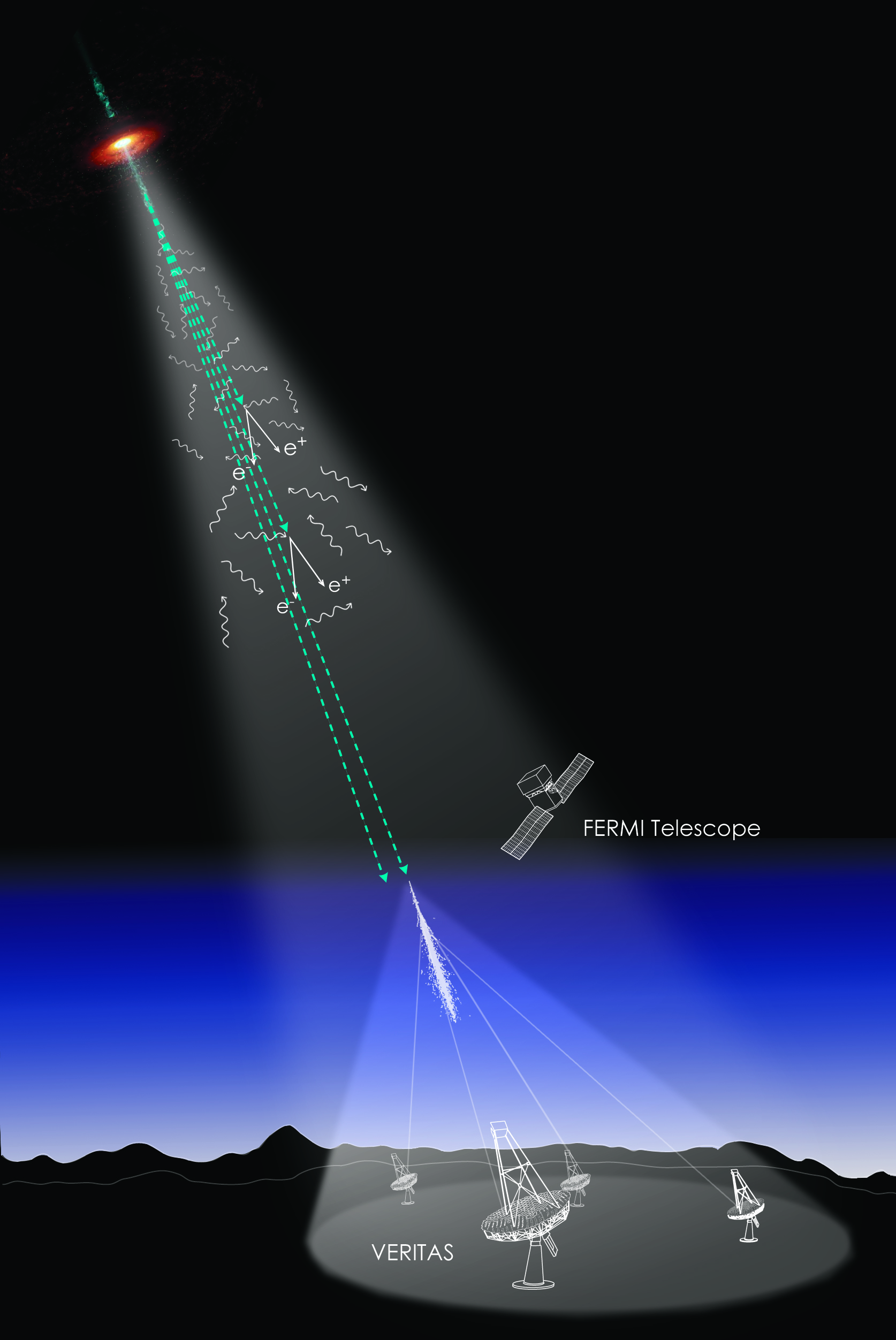 The attached figure illustrates how energetic gamma rays (dashed lines) from a distant blazar strike photons of extragalactic background light (wavy lines) and produce pairs of electrons and positrons. The energetic gamma rays that are not attenuated by this process strike the upper atmosphere, producing a cascade of charged particles which make a cone of Čerenkov light that is detected by the array of imaging atmospheric Čerenkov telescopes on the ground. A high-resolution version of this image is available here.