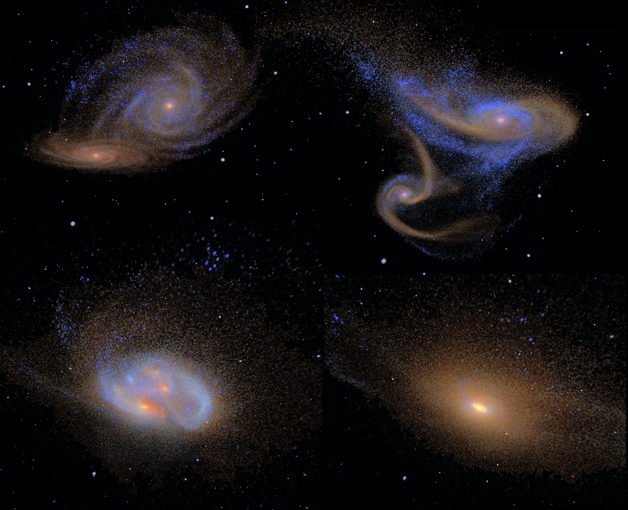 Galaxy Merger - Time sequence Mosaic shows the sequence of events as two spiral galaxies like our own Milky Way merge. As the two galaxies approach (upper left), on their first close pass, they sideswipe each other, throwing out long tails of stars and gas (upper right). They then move apart before gravity pulls them back together again and their centers merge, when the stars at greater distances from the center are tossed into random orbits (lower left). Eventually the merged spiral galaxies form an elliptical galaxy (lower right).